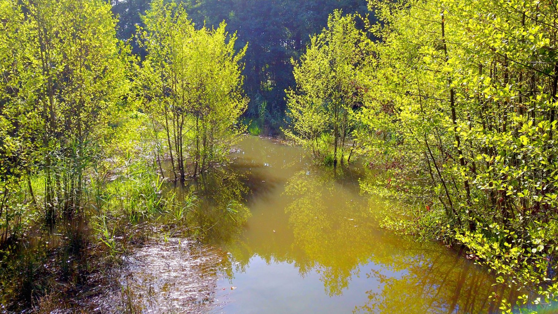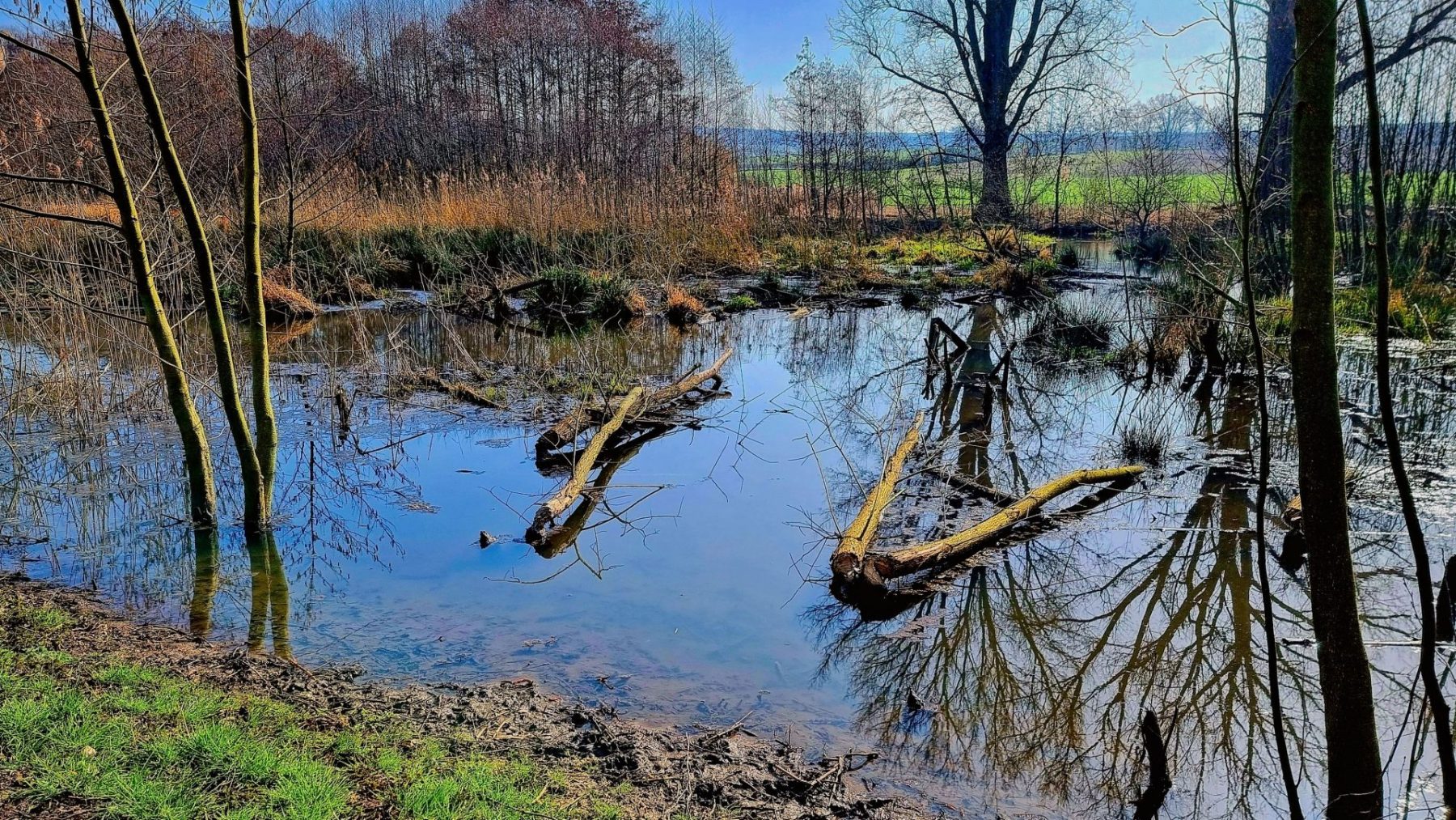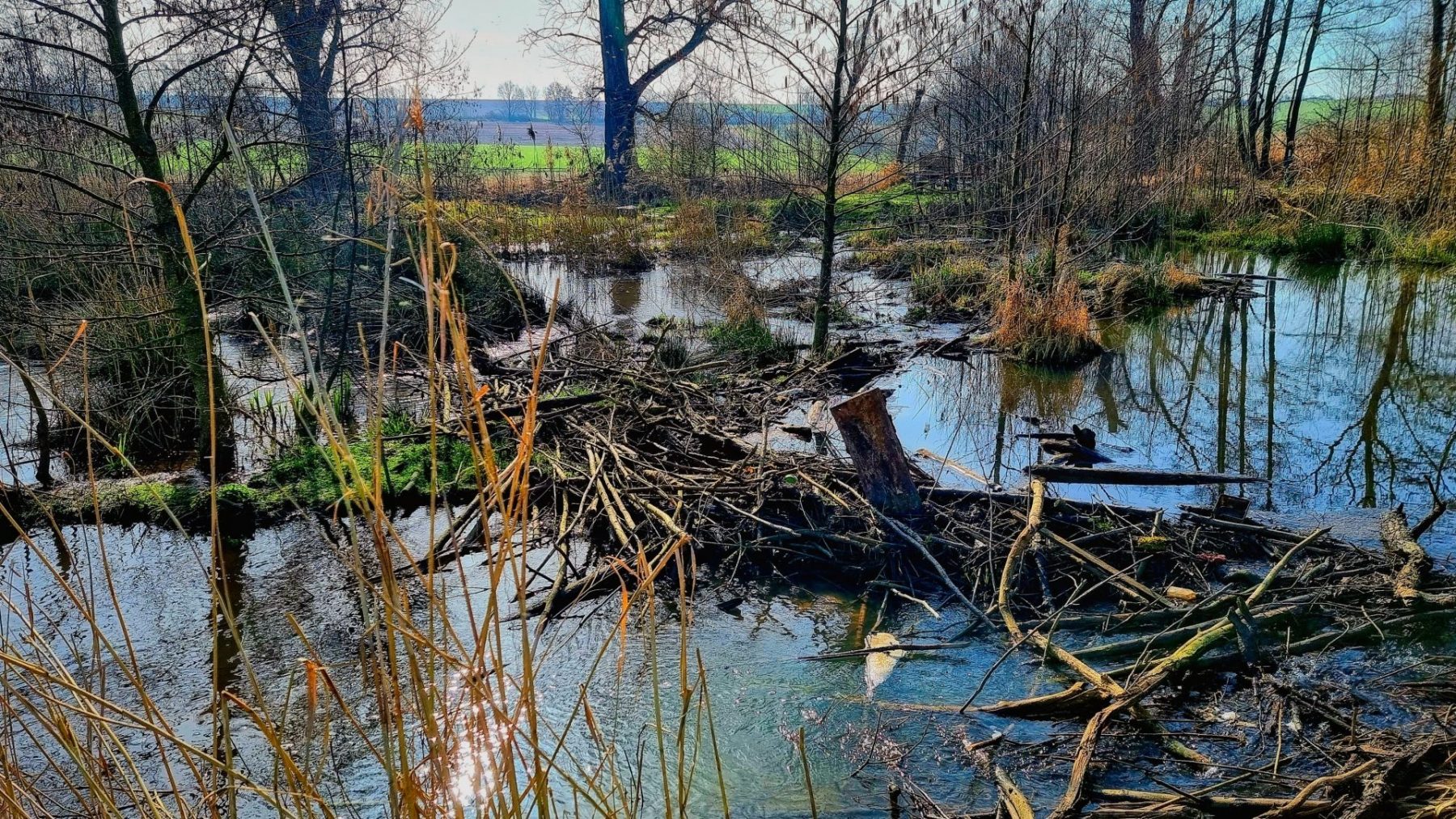 Nur 6 Jahre nach der Fertigstellung hat sich das Erscheinungsbild der Renaturierung völlig geändert. Vor allem durch den Einfluss der Biberfamilie ist aus dem Bachlauf eine Wasserlandschaft mit Tümpeln, Teichen und verzweigten Bachläufen geworden. Ein Paradies für Amphibien, Vögel und Insekten. Eine kleine Wildnis inmitten der Kulturlandschaft um Ebertsheim.